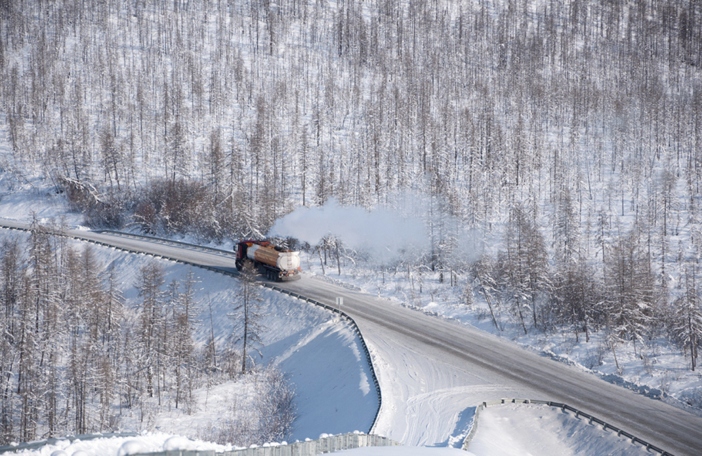 The road is traversable usually during the winter, when it’s covered in mud. During a wet summer, the mud makes any travel impossible. The place is so cold that in winter, car engines are never shut off to prevent the engine oil from freezing. If the car is shut off, the engine may never start again.